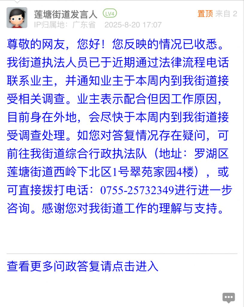 尊敬的網友,您好!您反映的情況已收悉。我街道執法人員已于近期通過法律流程電話聯系業主,并通知業主于本周內到我街道接受相關調查。業主表示配合但因工作原因,目前身在外地,會盡快于本周內到我街道接受調查處理。如您對答復情況存在疑問,可前往我街道綜合行政執法隊(地址:羅湖區蓮塘街道西嶺下北區1號翠苑家園4樓),或可直接撥打電話:0755-25732349進行進一步咨詢。感謝您對我街道工作的理解與支持。