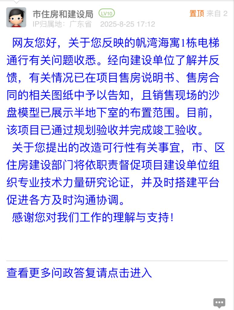 網友您好,關于您反映的帆灣海寓1棟電梯通行有關問題收悉。經向建設單位了解并反饋,有關情況已在項目售房說明書、售房合同的相關圖紙中予以告知,且銷售現場的沙盤模型已展示半地下室的布置范圍。目前,該項目已通過規劃驗收并完成竣工驗收。