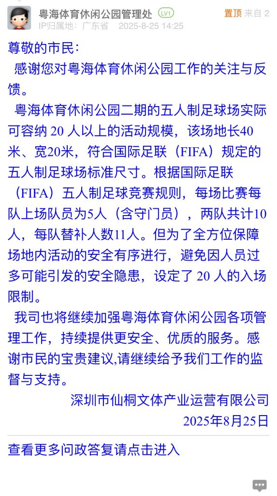 我司也將繼續加強粵海體育休閑公園各項管理工作,持續提供更安全、優質的服務。感謝市民的寶貴建議,請繼續給予我們工作的監督與支持。