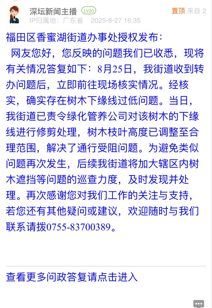 網友您好,您反映的問題我們已收悉,現將有關情況答復如下:8月25日,我街道收到轉辦問題后,立即前往現場核實情況。經核實,確實存在樹木下緣線過低問題。當日,我街道已責令綠化管養公司對該樹木的下緣線進行修剪處理,樹木枝葉高度已調整至合理范圍,解決了通行受阻問題。為避免類似問題再次發生,后續我街道將加大轄區內樹木遮擋等問題的巡查力度,及時發現并處理。再次感謝您對我們工作的關注與支持,若您還有其他疑問或建議,歡迎隨時與我們聯系請撥0755-83700389。