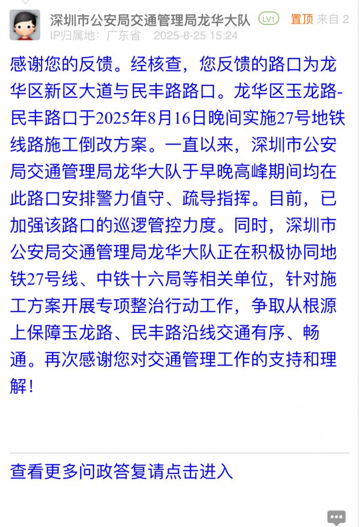 感謝您的反饋。經核查,您反饋的路口為龍華區新區大道與民豐路路口。龍華區玉龍路-民豐路口于2025年8月16日晚間實施27號地鐵線路施工倒改方案。一直以來,深圳市公安局交通管理局龍華大隊于早晚高峰期間均在此路口安排警力值守、疏導指揮。目前,已加強該路口的巡邏管控力度。同時,深圳市公安局交通管理局龍華大隊正在積極協同地鐵27號線、中鐵十六局等相關單位,針對施工方案開展專項整治行動工作,爭取從根源上保障玉龍路、民豐路沿線交通有序、暢通。再次感謝您對交通管理工作的支持和理解!