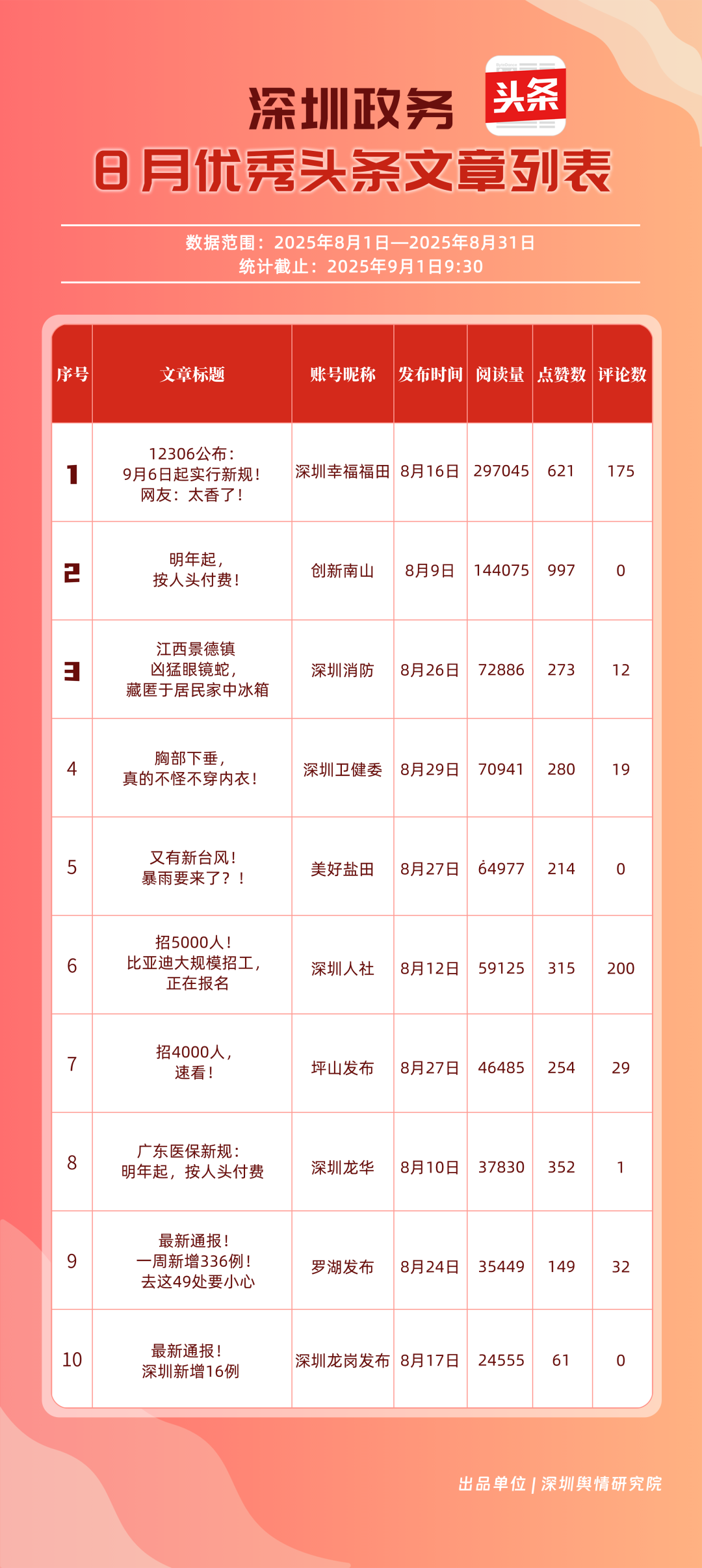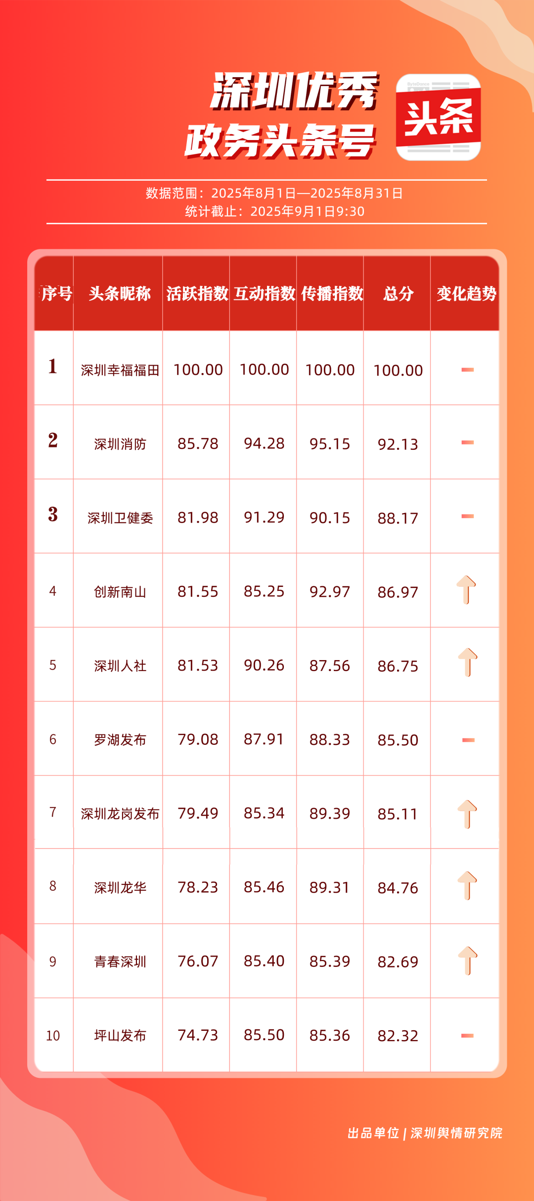 8月,“深圳幸福福田”“深圳消防”“深圳衛健委”“創新南山”“深圳人社”“羅湖發布”“深圳龍崗發布”“深圳龍華”“青春深圳”“坪山發布”共10個政務頭條號入選“優秀政務頭條號”榜單?!吧钲谛腋8L铩睉{借持續優異的綜合表現,以滿分成績穩居榜單首位,彰顯出強大的政務傳播力與影響力;“深圳消防”“深圳衛健委”則以穩定的內容質量與深厚的民眾基礎,持續為市民提供權威、及時的服務信息,排名穩固?!皠撔履仙健薄吧钲谌松纭钡壬习褓~號亦表現亮眼,聚焦民生服務傳遞政策溫度,共同構成政務新媒體矩陣的中堅力量,為城市治理與民生服務注入鮮活動能。
