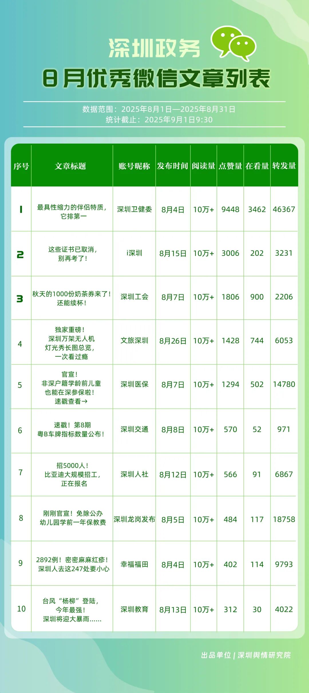 8月,30個政務微信公眾號入選“深圳優秀政務微信公眾號”榜單,其中包括“深圳衛健委”“深圳龍崗發布”“幸福福田”“i深圳”“創新南山”“深圳工會”“青春深圳”“深圳龍華”“深圳教育”“深圳光明”等。8月,“深圳衛健委”66篇推文獲得超10萬次閱讀,以滿分位于榜單首位;“深圳龍崗發布”積極傳遞民生信息,依托區域活動開展宣傳,推動傳播效果顯著提升,位居第二;“幸福福田”關注區域發展動態,排名第三。“i深圳”“創新南山”“深圳工會”“青春深圳”等政務賬號在信息發布中不斷提升內容豐富性,深耕優質服務,評分在85分以上。上榜微信公眾號立足自身特色優勢,以精品內容為核心競爭力,在政務傳播領域樹立了標桿形象,成為兼具影響力與公信力的示范樣本。
