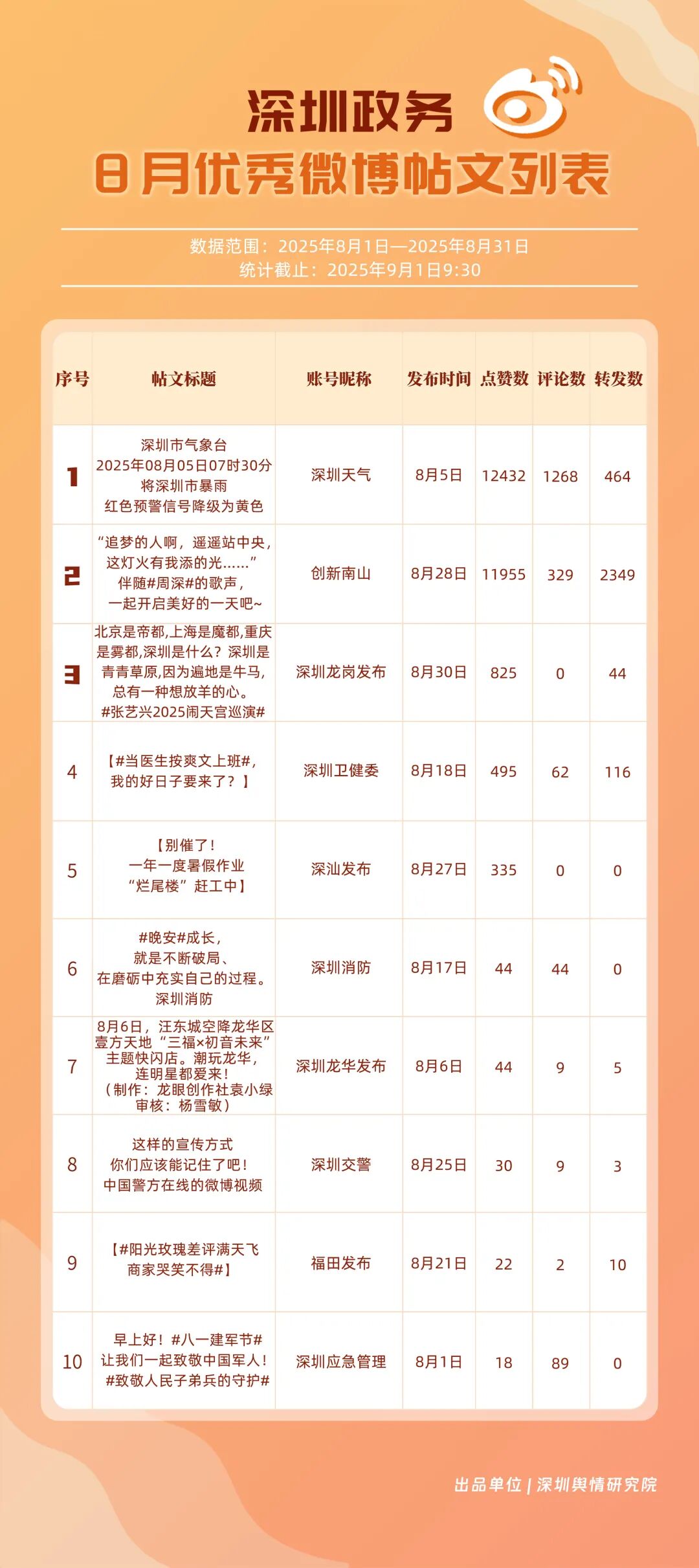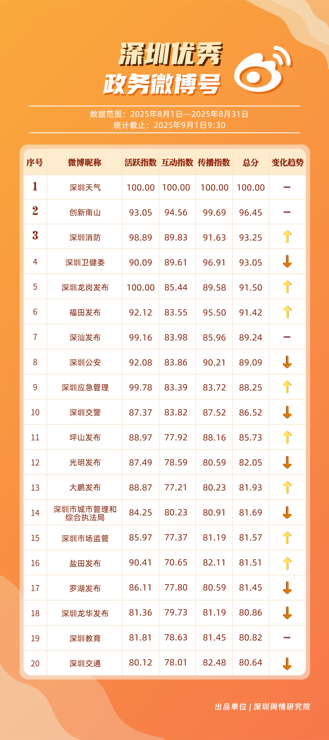 8月,“深圳天氣”“創新南山”“深圳消防”“深圳衛健委”“深圳龍崗發布”“福田發布”“深汕發布”“深圳公安”“深圳應急管理”“深圳交警”等20個賬號入選“優秀政務微博號”。其中,“深圳天氣”持續以優質內容受到網民肯定,蟬聯榜首;“創新南山”傳播指數得分再提升,總分96.45,排名保持在第二位;“深圳消防”積極發布消防相關內容,以93.25分位列第三。上榜優秀政務微博賬號精準把握網民興趣點,內容獨具風采,收獲網民認可,實現了較好的傳播效果。