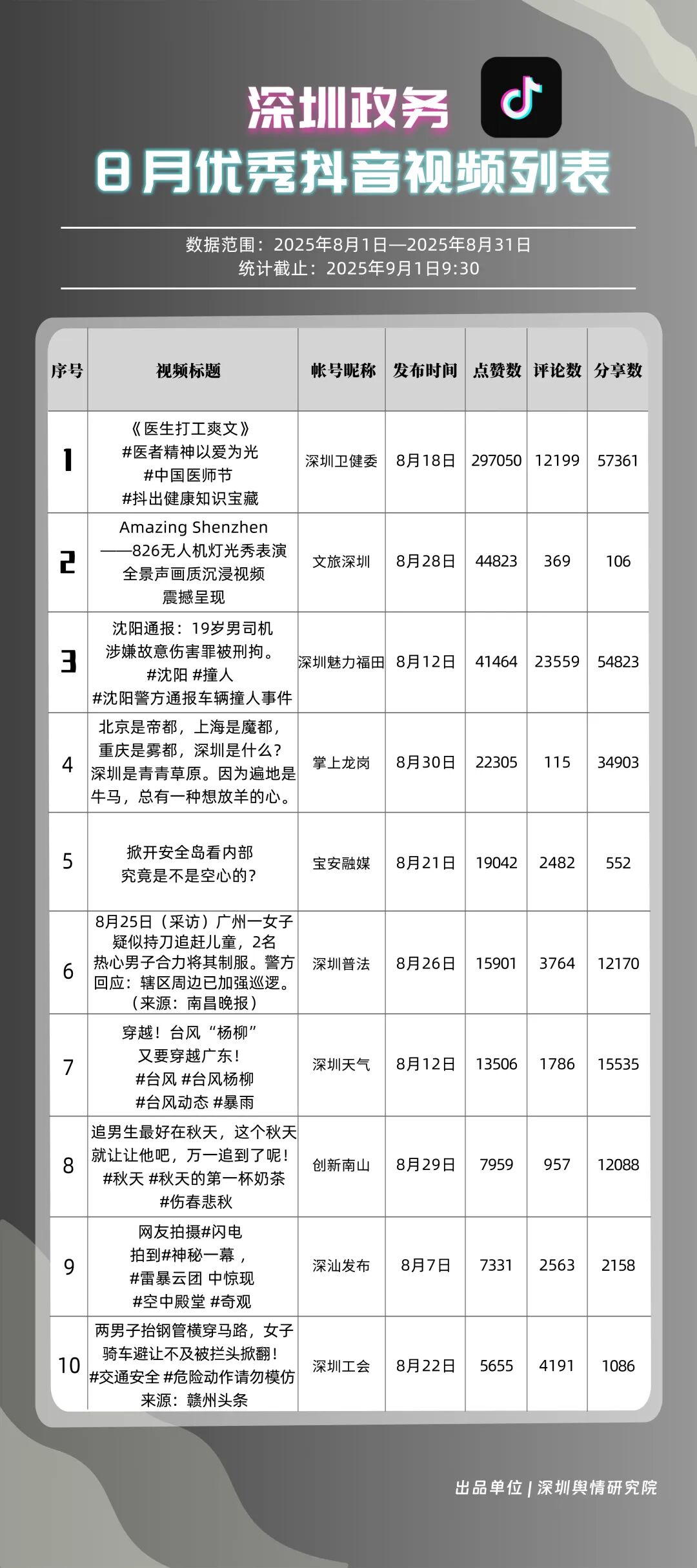 8月,“深圳衛健委”“深汕發布”“深圳魅力福田”“深圳天氣”“掌上龍崗”“DOU愛龍華”“創新南山”“深圳普法”“文旅深圳”“美好鹽田”共10個政務抖音號獲得“優秀政務抖音號”稱號。“深圳衛健委”內容吸引大量網民關注,4條視頻累計獲得超50萬次點贊,排名從上期的第九名上升至第一名;“深汕發布”憑借較高的傳播指數評分,位列第二名,排名有所上升?!吧钲邝攘ΩL铩薄吧钲谔鞖狻钡荣~號緊隨其后,得分均在95分左右。上榜的優秀政務抖音號深耕優質創作,精準把握網民興趣點,使作品收獲高點贊、高轉發,推動評論區形成良性互動氛圍,以優秀內容提升政務傳播效能。