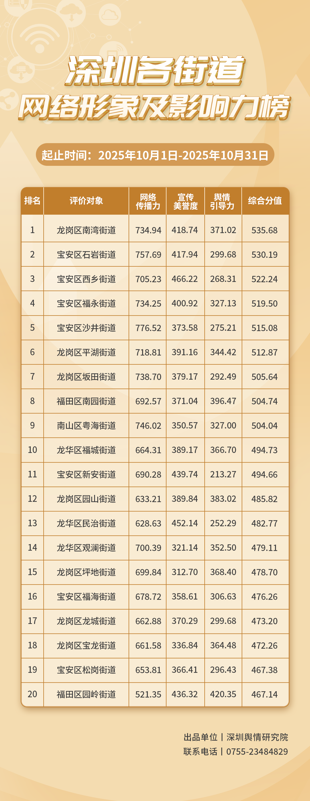 2025年10月,共有20個街道登上《深圳各街道網絡形象及影響力榜》,分別是:龍崗區南灣街道、寶安區石巖街道、寶安區西鄉街道、寶安區福永街道、寶安區沙井街道、龍崗區平湖街道、龍崗區坂田街道、福田區南園街道、南山區粵海街道、龍華區福城街道、寶安區新安街道、龍崗區園山街道、龍華區民治街道、龍華區觀瀾街道、龍崗區坪地街道、寶安區福海街道、龍崗區龍城街道、龍崗區寶龍街道、寶安區松崗街道、福田區園嶺街道。